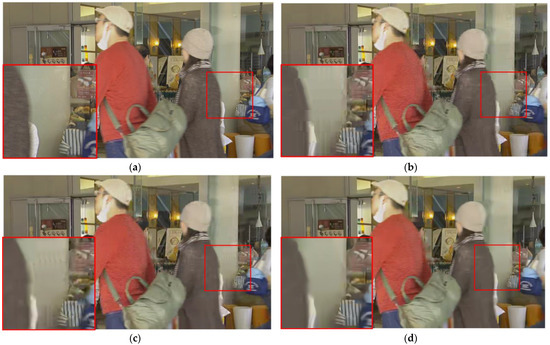 Comparison of visual experience in BQMall from HEVC test sequences (QP = 37). (a) Ground truth; (b) HEVC disabled in-loop filter; (c) HEVC baseline; (d) our proposed method.