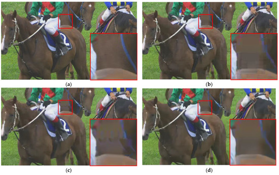 Comparison of visual experience in RaceHorses from HEVC test sequences (QP = 37). (a) Ground truth; (b) HEVC disabled in-loop filter; (c) HEVC baseline; (d) our proposed method.