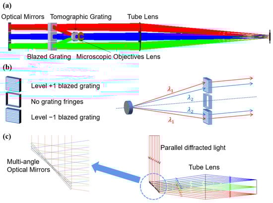 In recent years, tomographic microscopy has been widely used in the biological and life sciences. It is commonly used for 3D structure detection of biological cells and for the observation of the life activities of tiny living organisms [1,2,3,4,5,6]. Optical microscopes allow for the observation of transparent objects but usually provide only superficial images, which do not permit the observation of the internal structure of the object. The 3D microscope was developed based on the principle of secondary-phase grating spectroscopy [7,8,9,10,11,12], which enables real-time acquisition of the multilayer image information of biological samples in a single observation [13,14], eliminating the need to observe multiple layers of cell sample sections. It greatly improves the acquisition and observation efficiency. Therefore, secondary-phase gratings, also known as tomographic gratings, are the core devices in optical tomographic microscopy systems. However, chromatic aberration exists in tomographic gratings under broadband illumination. Multiple wavelengths overlapping each other can cover the details of the image and affect the judgment of the image details [9].