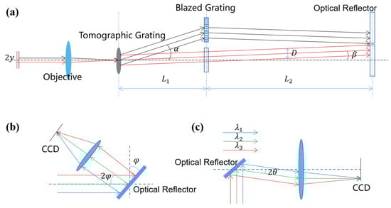 Figure 2a shows the profile of the system from the object plane to the reflector plane, and only levels 0 and +1 are drawn to facilitate the calibration parameters. Figure 2b shows the profile from the reflector plane to the CCD plane at one diffraction level, and Figure 2c shows the effect of the reflector tilt on the image position on the CCD. In the case of levels +1 and 0, for example, the design process must ensure that the +1 and 0 diffracted light are separated in the plane of the reflector. If the level-+1 and level-0 diffracted light overlap on the reflector plane, the corresponding reflectors will overlap, the reflector will be unable to achieve separate regulation of the light angle of a single diffraction stage, and the image chromatic aberration of the overlapped part cannot be corrected. As shown in Figure 2a, let the maximum line field of view of the object side be . The through-light aperture is D; the incident angle of the tomographic grating corresponding to the maximum line field of view is β, and the corresponding diffraction angle is α; the distance between the tomographic grating and the blazed grating plane is ; and the distance between the blazed grating plane and the reflector plane is . The condition (1) that the two diffracted light beams do not coincide is expressed by Equation (1):