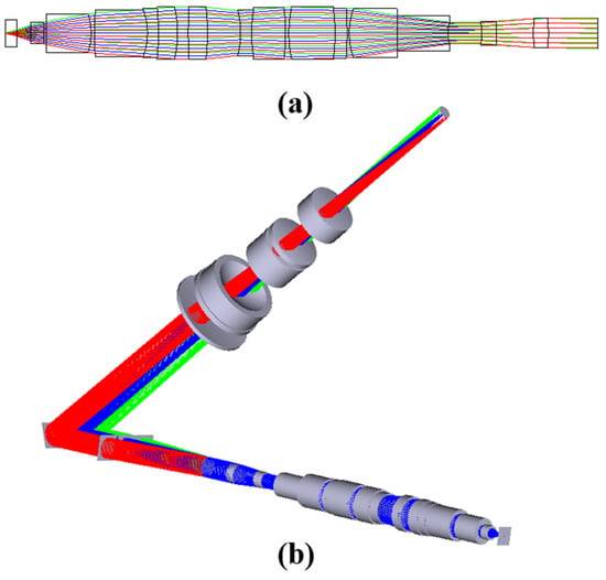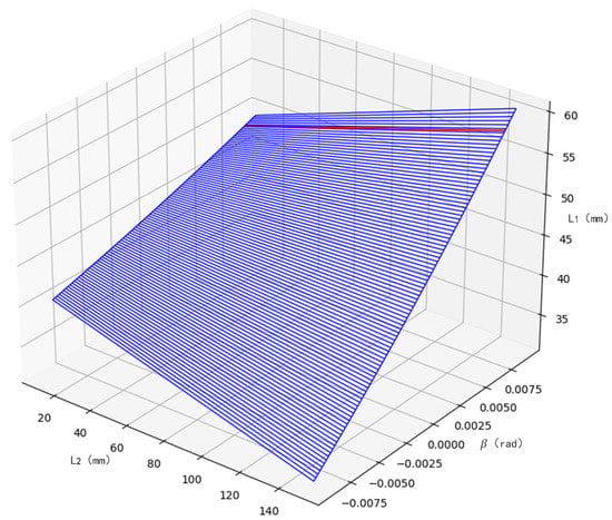 To satisfy the requirements of Equation (1), we plot the relationship between and β by combining the parameters in Table 1 and constraints 1, 2, 3, and 4, as shown in Figure 3. Above the blue surface are the combinations of , and β that can be selected. Set the object-side field of view to 0.3 mm, corresponding to the β value of 0.008 and corresponding to the red curve in Figure 3. The range of values of and is derived from constraints 2, 3, and 4 as follows: 40 mm ≤ ≤ 62 mm, ≥ 12.5 mm. The priority in the parameter selection is to make as large as possible and to move away from the boundary, leaving a margin for installation. The final choice is 60 mm for and 50 mm for .
