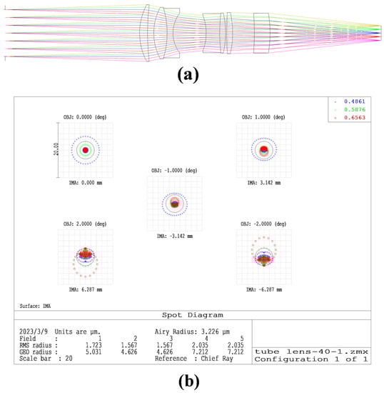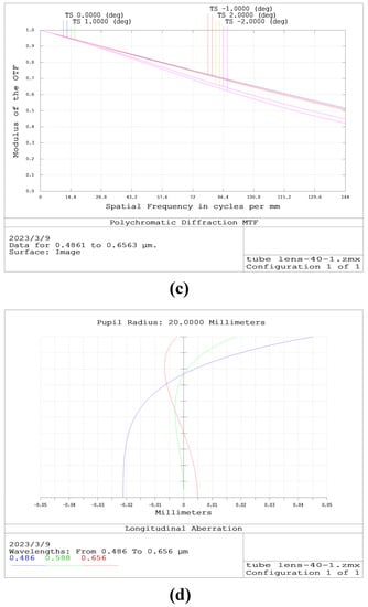 The tube lens requirements to design the image-space telecentric structure are in accordance with the parameters in Table 2 [26]. To simplify the design, we chose a double Gaussian objective as the original structure [27]. To meet the design requirements, we added a lens during the design process. The final optical structure and image quality evaluation are shown in Figure 4. The optical structure of the tube lens is in Supplementary Material S1.