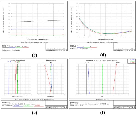 In the construction of the whole system, multiple objective surfaces, grating diffraction stages, and multiple reflectors are simulated using multiple structures. The optical structure of the microscope objective used is shown in Figure 5a. The optical structure of the microscope objective is in Supplementary Material S2. The simulation results of the reflector-separated light dispersion-compensated 3D microscopy system are shown in Figure 5b. The relationship between RMS and the field of view is shown in Figure 5c. The relationship between RMS and wavelength is shown in Figure 5d. Figure 5e shows the dispersion and field curvature of the system. Figure 5f shows the lateral color of the system. It can be seen that the lateral color of the system is within the diffraction limit.