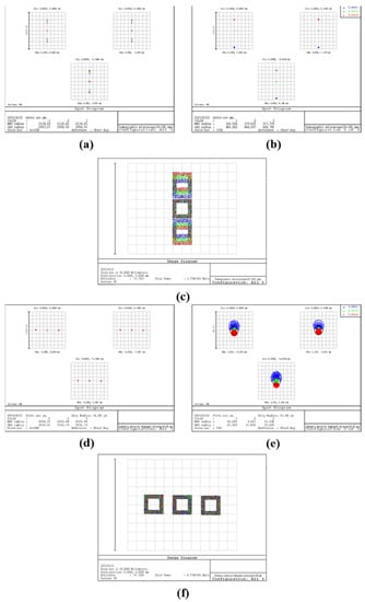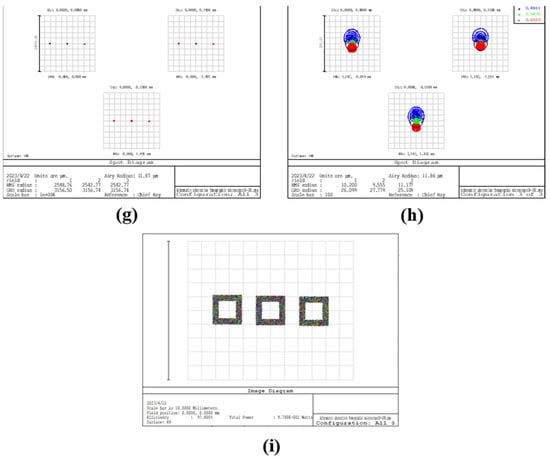 The reflector-separated light dispersion-compensated 3D microscope system design was completed, and its chromatic aberration correction function was verified. Figure 6 shows the spot diagram and image simulation results for the normal tomographic microscope and two sets of reflector-separated light dispersion-compensated tomographic microscopes, where (, ) was taken as (60 mm, 50 mm) and (55 mm, 30 mm).