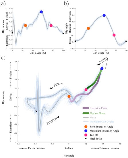 During the terminal stance and pre-swing phases, the hip moment–angle relationship moves in a greater extension angle and higher flexion moment direction, before it starts moving in the opposite direction (Figure 1c). For this reason, this region was divided into two phases. The hip extension motion phase started at a 0 radian hip joint angle and ended at the maximum hip extension angle. The hip flexion motion phase started at the maximum hip extension angle and ended at toe-off. These definitions were derived from a previous study [6], and were tailored for this study for feasibility reasons.