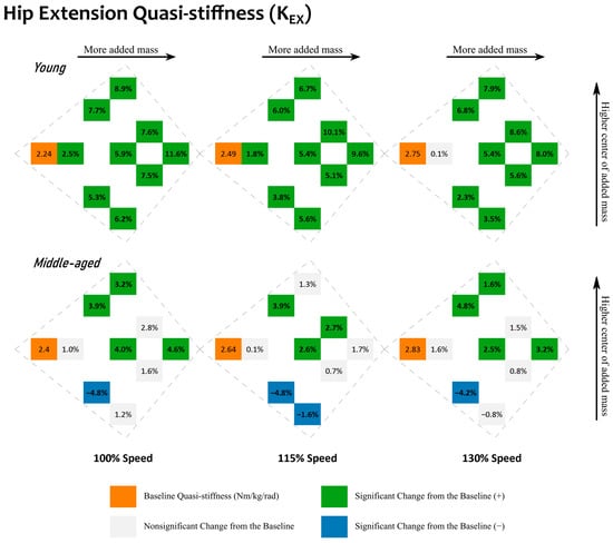 Changes in the sagittal plane hip joint quasi-stiffness during hip extension, KEX. Results for young adults are located in the first row. Results for middle-aged adults are located in the second row. Results for walking at different speeds (100, 115, and 130%) are located in the columns. Baseline conditions are highlighted in orange with a unit of Nm/kg/rad. Other values are relative differences with respect to the baseline value within the same cluster. Comparisons that are statistically significant (p < 0.05) are in bold with a green background for a positive (+) change and a blue background for a negative (−) change. Comparisons that are nonsignificant have a gray background. Within each cluster, added mass conditions with a higher total amount of added mass sit further to the right, and those with a higher center of added mass sit further away from the bottom.