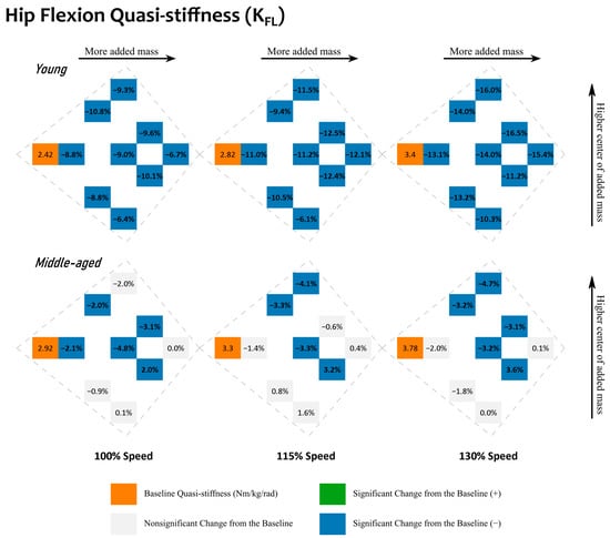 Changes in the sagittal plane hip joint quasi-stiffness during hip flexion, KFL. Results for young adults are located in the first row. Results for middle-aged adults are located in the second row. Results for walking at different speeds (100, 115, and 130%) are located in the columns. Baseline conditions are highlighted in orange with a unit of Nm/kg/rad. Other values are relative differences with respect to the baseline value within the same cluster. Comparisons that are statistically significant (p < 0.05) are in bold with a green background for a positive (+) change and a blue background for a negative (−) change. Comparisons that are nonsignificant have a gray background. Within each cluster, added mass conditions with a higher total amount of added mass sit further to the right, and those with a higher center of added mass sit further away from the bottom.