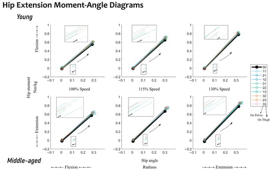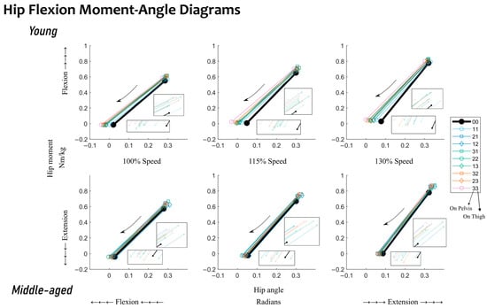 During hip flexion, a statistical difference between quasi-stiffness in young and middle-aged adults was observed; see Table 2. Middle-aged adults’ quasi-stiffness was 27.4% higher than that of young adults. The moment–angle diagrams show that the difference in quasi-stiffness can be attributed to differences in the hip angle at the end point (toe-off) between the two age groups (Figure 5). No statistical differences were observed between the two groups in work during hip flexion when mechanical work was generated at the hip joint. Given the statistical differences observed between the two groups, the following discussion will be split into the influences of walking speed and added mass within each age group.