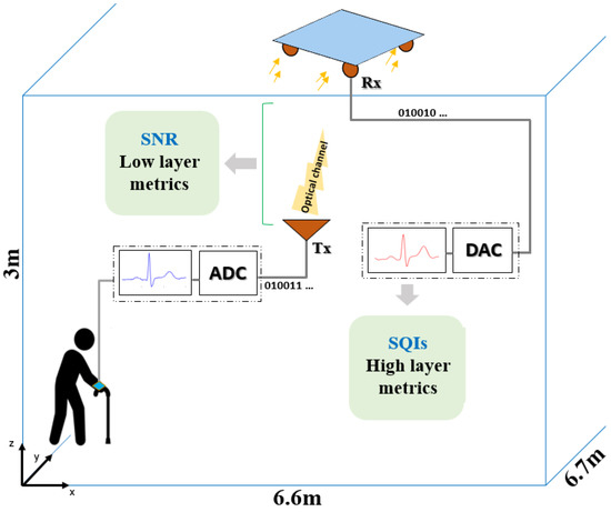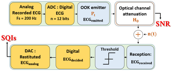 Thus, to discuss the reliability of ECG in detecting cardiac symptoms during regular follow-up, it is essential to assess the impact of optical transmission reliability on SQIs. Among the published works, the impact of OWC on the ECG SQIs, in particular, the spectral and statistical characteristics of interest, has not been analyzed, except in [29], where the quality of a VLC-based ECG signal was evaluated in terms of RR peak accuracy as a function of receiver sensitivity.