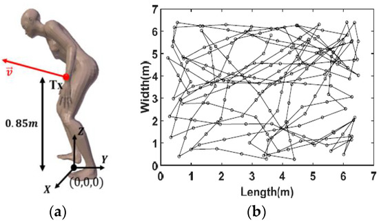 (a) Figure of elderly person, (b) example of the person’s travel trajectory using the RW mobility model [13].
