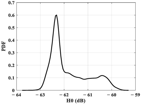 Figure 3 shows the distribution of the gains considering an optical source with a half-power angle of and assuming that the elderly person occupied positions over approximately 1 h. The distribution shows a probable maximum gain value of −60.6 dB.