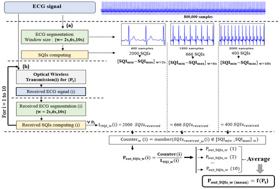 In the second step, we used the transmission chain detailed in Section 4.1 to recover the received ECG signal after it had been transmitted over the studied optical channel and evaluated its quality. For this purpose, we applied the same windowing method used before transmission and calculated the received SQIs at each window for which we obtained a set of received SQIs (refer to Figure 6(b)).