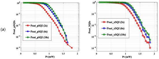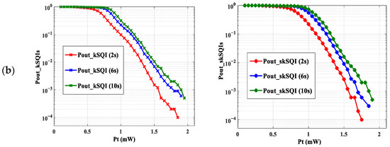 By varying the emitted power values, we studied the robustness of SQIs as a function of the optical transmission conditions. Based on the second step of our methodology (Figure 6(b)), for each value, the received ECG signal was segmented using the previously defined windowing method, i.e., by considering window sizes of , , . Likewise, for each w value, the received spectral and statistical SQIs were computed. Then, from these received SQIs values, we used (12) and the results of Table 2 to determine for each value the corresponding outage probabilities. We repeated the process 10 times, as mentioned in Figure 6(b), and averaged the results to smooth the variations related to the randomness of the noise resulting from the optical transmission process.