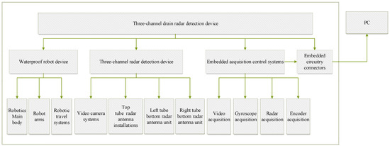 The three-channel drainage pipeline GPR inspection device includes a waterproof pipeline robot device, a GPR detection device, an embedded acquisition and control system, an embedded interface circuit, and a host computer, as shown in Figure 1.