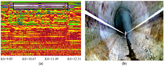 The typical void defect GPR image is shown in Figure 9. The void interface has strong reflection, which is distributed in an approximate horizontal band with multiple reflection signals. The detected void is located on the left side of the survey line with the pipe section number of 25,822~28,384 and starting and ending mileages of 9.9~11.8 m.