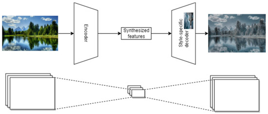 The neural style transfer is achieved by combining the encoder trained on the input image and the decoder trained on the style, so that the compressed input image is expanded in the style learned by the decoder (Figure 3).