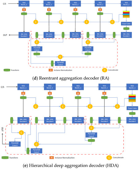 Each proposed aggregation strategy uses the pre-trained VGG-19 for the image classification network as the encoder and features a structurally asymmetric decoder, unlike PhotoNet, which maintains the symmetry between these two main components. Depending on the architecture’s type, deep feature aggregation is applied along the decoder to merge (concatenate) and fuse (reduce by convolutional pyramids) multi-level features in a different manner. As in [1], we used normalized skip connections at each level to directly pass extracted feature characteristics from the encoder to the corresponding decoder layer, improving the stylized image quality. Transfer modules were placed at every instance normalized skip link (INSL) stage and fuse node to enhance stylization. Each new strategy represents an end-to-end photorealistic universal style transfer solution for the given styles; hence, as in the case of [1], there was no need for pre- or post-processing operations. Furthermore, our implementation offers support for training decoders associated with new styles. Paper [7] depicts the generic photorealistic aggregation architectures shown below, in Figure 4.