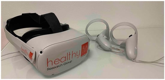 HMD Meta Quest II (Oculus VR, Menlo Park, CA, USA) was used. This system is standalone, requiring only 2 handsets and a Wi-Fi network for its use. The equipment used in this study included a more comfortable, ergonomic Elite strap which also contained an extra battery. An Apple iPad 10” was also provided so that the physical therapist could follow the performance of the task via the Oculus app more easily. The same hardware was employed with success in previous studies on martial art fighters [44] and in PD [40]. Figure 1 shows the equipment used.
