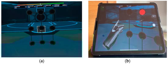 Micro wall mode of Rezzil game. Users must touch the red light as quickly as possible. (a) Screenshot of virtual scenario proposed for the test (3 × 3 grid) and placed in a virtual gym; (b) iPad and the view that the user and therapist are seeing simultaneously.