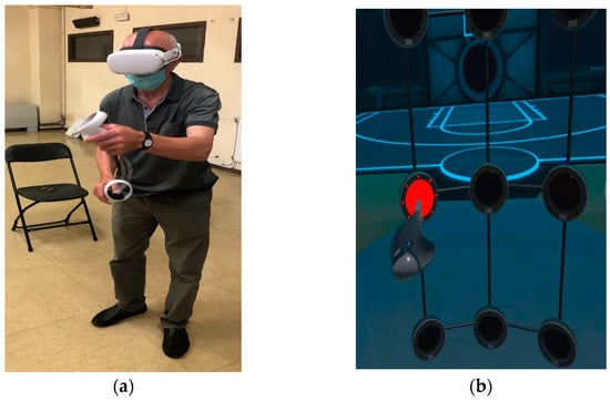 Participant during a session; (a) real movement and (b) virtual movement in the immersive scenario and red light as target.