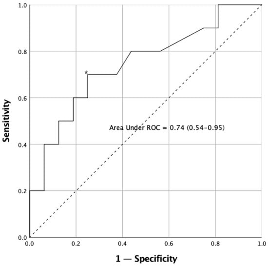 Receiver operating characteristic (ROC) curve for reaction time test in the sample. The asterisk (*) indicates the cut-off point that determines the highest joint sensitivity and specificity. The dashed line, running from point 0.0 to point 1.1 is called the reference diagonal, or line of non-discrimination. The solid line represents the cut-off points of the reaction time in relation to falls and provides information their respective sensitivity (Y axis) and 1—specificity (X axis). Both axes of the graph include values ranging from 0 to 1 (0–100%).