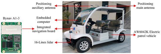 The control object in this paper is an electric patrol vehicle (AW6042K, ALWAYZ, Chuzhou, China) equipped with 16-line lidar (RS-16, RoboSense, Shenzhen, China), a Bynav A1-series high-precision navigation board (A1-3, Bynav, Changsha, China), and a bottom controller for the vehicle. The overview of the autonomous vehicle and its sensors is shown in Figure 1 and the parameters are provided in Table 1.