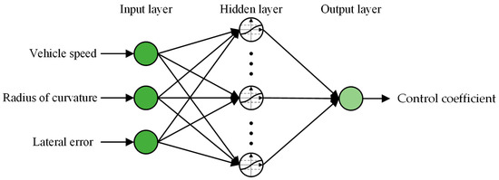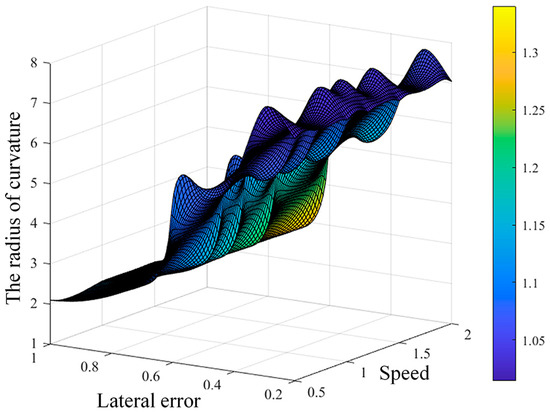 The training set of neural networks is obtained by setting up curves of different curvatures, using different speed and lateral error estimates, recording the control coefficient with minimum relative tracking errors, and obtaining 100 sets of training data. Among the input parameters of the training set are the vehicle speed, the radius of curvature, and the lateral error, and the output parameter is the control coefficient. The relationship between input and output is shown in Figure 5.