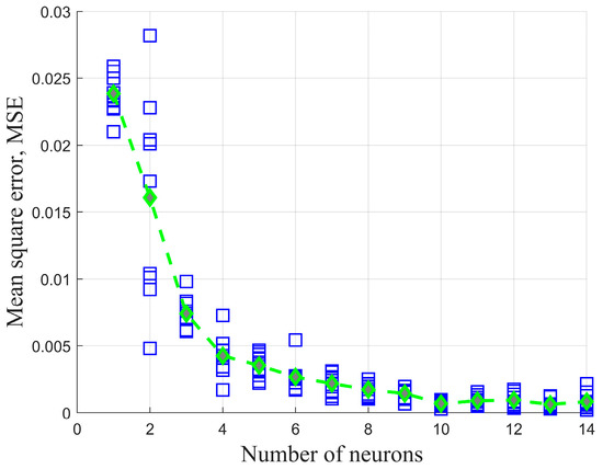 According to Formula (21), the range of the number of hidden layer nodes is determined to be . Different numbers of hidden layer nodes are set within this range, and the dataset is used to train the model 10 times. The prediction accuracy on the test set is then calculated and compared for different numbers of hidden layer nodes [35]. As shown in Figure 7, the MSE gradually decreases as the number of hidden layer nodes increases in the range of . When the number of nodes is 10, the MSE basically converges. Therefore, in this study, the number of hidden layer nodes is set to 10.