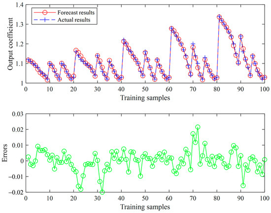 Figure 8 indicates that the minimum mean square error and the corresponding correlation coefficient at the 8th iteration are and 0.99637, respectively. Figure 9 shows the distribution of the coefficient error obtained from the training data. The predicted value of the output coefficient is compared with the experiment. The error mainly varies within the range (−0.01, 0.01) and the average error is 0.0048. The results reveal that the error is relatively small, and the model meets the accuracy requirements.