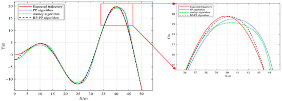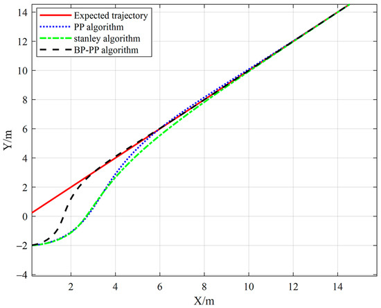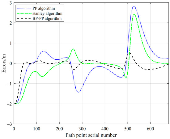 The obtained results show that the BP–PP algorithm has the fastest response speed. When the initial error is 2 m, the vehicle can track the path stably for about 5 m. After stable tracking, the average tracking error of the PP algorithm, Stanley algorithm, and BP–PP algorithm on the straight path is 0.038 m, 0.049 m, and 0.013 m, respectively.