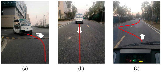 The experiment was conducted on two two-way lanes with a width of 7 m. The area enclosed by the road was approximately rectangular, with a unilateral side length of about 100 m. The road surface is asphalt, moderately hard, and there is a speed bump at the bend. Figure 14a describes the tracking scene of the vehicle in a right-angle curve, Figure 14b describes the tracking scene of the vehicle in a straight line, and Figure 14c describes the tracking scene of the vehicle in an arched curve. It is worth noting that the GNSS module must be working in RTK mode before experimenting.