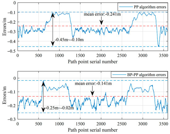 The tracking error is calculated by comparing the recorded GPS data with the target path after the vehicle has achieved stable tracking. The obtained results in this regard are shown in Figure 16. The analysis demonstrates that the vehicle can quickly track the path for an initial error of −0.24 m. Moreover, Table 3 indicates that the deceleration bumps do not affect the tracking results for tracking on a rectangular curve. It is inferred that compared with the conventional PP algorithm, the BP–PP algorithm effectively reduces the vehicle’s tracking error on curved and straight paths, thereby reflecting the superiority of the proposed control method.