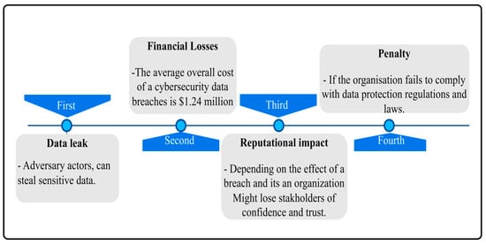 The Centre for Strategic and International Studies (CSIS) estimates that cybercrime costs the global economy more than $400 billion every year [11]. Additionally, a report released by McAfee in December 2020 reveals that the global cost of cybercrime losses has surpassed $1 trillion, increasing by over 50% since 2018 [12]. Furthermore, IBM’s 2020 report states that the average cost of a cybersecurity data breach is $1.24 million [13]. These statistics demonstrate that no industry is immune to cybercrime’s growing impact, emphasizing the need to prioritize security measures, tools, and solutions to address the most critical vulnerabilities in the infrastructure. Predicting cyberattacks is crucial for protecting CI systems from potential cyber threats. A cyberattack can affect an organization in four different ways, including data leaks involving sensitive data, personal data of consumers, and an organization’s intellectual property, as well as financial losses, reputational damage, and penalties resulting from failing to comply with data protection regulations established by government agencies. Figure 2 illustrates these consequences [14].