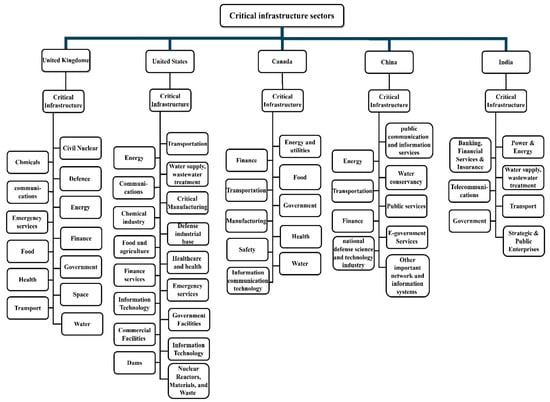 Different countries have different ways of categorizing critical infrastructure (CI) sectors, which are crucial for the functioning of their economy, society, security, and services. For instance, in the US, the National Infrastructure Protection Plan (NIPP), in 2013, categorized CI into 16 sectors, such as energy, water and wastewater systems, healthcare and public health, information technology, transportation systems, etc. [38]. Similarly, the European Union classified CIs into 13 categories, including energy, ICT, water, food, health, financial, and public safety, among others. These categorizations help to sort the critical infrastructure based on their impacts and effects. Figure 3 depicts the categorization of CI in various countries [17].