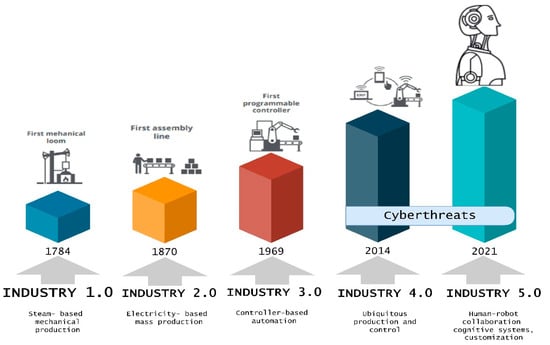 The digitalized integration and intelligent industrial engineering of I4.0 have transformed the manufacturing paradigm. As a result, cyber threats have intensified and expanded beyond those observed in the digital network, as CI systems become increasingly networked. The manufacturing lines could be subject to attacks that lead to monetary loss, worker safety issues, or poor product quality. Moreover, the networks could also be vulnerable to attacks, leading to misuse or shutdowns. The evolution of industrial revolution is posing new threats, as illustrated in Figure 4.