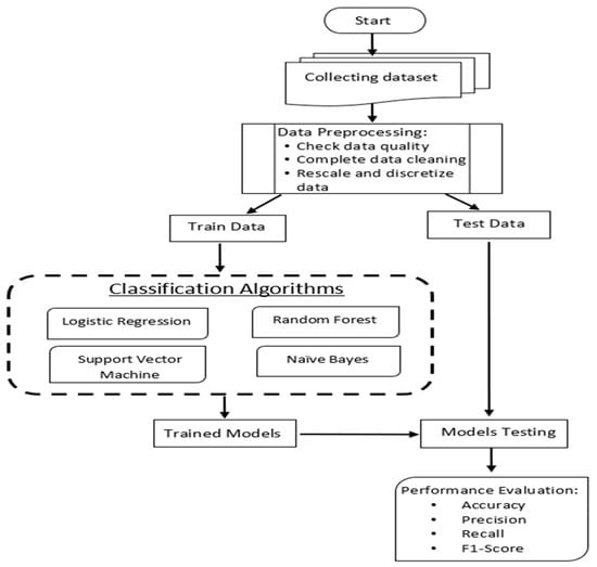 To effectively apply ML principles, datasets must be properly normalized; data collected from different resources [43,44] contain recent cybersecurity incidents. In the current phase, the features are the attacked organization’s infrastructure, the incidents’ data, and the motivation that stimulated the attack. The proposed approach is an attempt to predict the methods that have been used in such attacks. In this work, after collecting more than 400 incidents, data cleansing for the raw data was performed, as well as exploring the data to obtain more insight into the incident’s patterns. For the model training, we have split our dataset into testing and training subsets. The ratio used for our experiments was 80% for training and 20% for testing. This has resulted in a total of 320 entries for training and 80 for testing. The testing part will be utilized to evaluate the performance of our trained model. Whereas the training part will be used to train the algorithms. We have predicted cyberattacks from the testing part of our dataset after training the chosen algorithms, which were used in our models. Then, the predictions were used to assess the performance of the model using the performance metrics of accuracy, recall, precision, and F1-score. Finally, this task is performed by Algorithm 1, which summarizes the proposed approach: