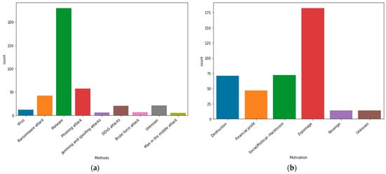 Attackers’ motivations have been identified as follows: destruction, financial profit, social/political (hacktivism), espionage, revenge, and unknown. Besides that, the attack methods have been determined as follows: virus, ransomware attack, phishing attack, jamming and spoofing attacks, DDoS attack, brute force attack, malware, man in the middle attack, and unknown. Additionally, the following charts illustrate the results in terms of cyberattack methods and attackers’ motives, which are implemented in the PCCI approach. Figure 8a,b show the count of attackers’ motivations and cyberattacks methods.