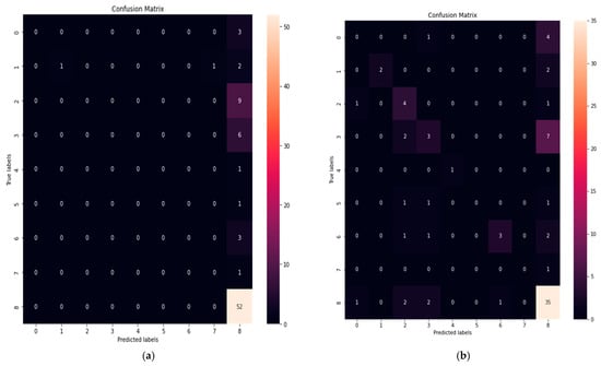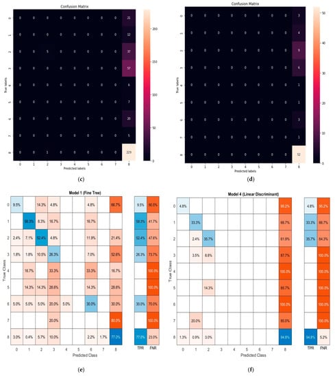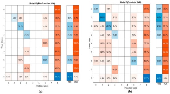 A classification problem’s prediction outcomes are summarised in a confusion matrix. The confusion matrix demonstrates how the classification model makes predictions while being confused. Count values are used to describe the number of accurate and inaccurate predictions for each class, which is the confusion matrix’s secret. The following, Figure 9a–h, show the confusion matrix for all the ML models we implemented in the PCCI approach.