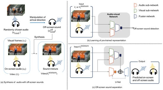 In A-V research, pre-training is used to learn the relationship between audio and video, and the obtained representations and models can be used in various downstream tasks. Particularly, self-supervised learning does not require annotation and has been reported to be effective for various A-V tasks [11,12,13]. A-V self-supervised learning aims to obtain a useful A-V feature for various types of A-V learning. A useful A-V feature has learned correlations between audio and video. Conventional studies have focused on semantic [11], temporal [12], and spatial [13] correspondences. In these studies, the A-V model learns whether the input audio semantically, temporally, or spatially matches the video. Among these correspondences, spatial information is considered to play an essential role in OSS separation because sounds coming from off-screen spatial locations are OSSs. Yang et al. [13] focused on spatial information by assigning to the video the task of determining whether the audio is flipped left or right; the off-screen space was not considered. Accordingly, a pre-training method that considers the off-screen space is required. Regarding conventional studies that used OSSs as supervision, Owens et al. [20] indicated that ambient sounds are available for scene recognition, as the sound of wind corresponds to an outdoor scene. It may be true that OSSs can be used as supervision for scene recognition; however, OSSs may weaken the A-V correlations. Thus, we adopted a strategy to perform pre-training for separate OSSs and predict the inclusion of OSSs to understand the A-V correlation.