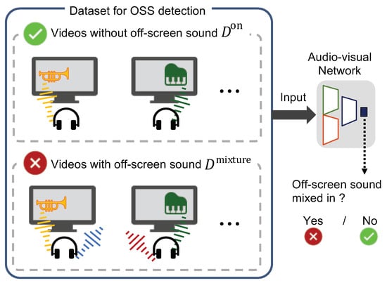 We used both the D on and D mixture datasets as the negative and positive samples for OSS detection, respectively. Specifically, while training the A-V network, let D = D on D mixture = { ( v , a , y ) i } i = 1 N be our video dataset, where y indicates whether OSSs are contaminated in audio a. Note that the pseudo label y can automatically be obtained using the characteristics of the audio and video correspondence. For the network training, the A-V network g ( v , a ) maximizes a classification cross-entropy objective given by the log-likelihood as follows: