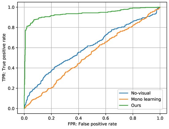We present the detection results in Table 1. Additionally, we show the ROC curves in Figure 4. Our method outperformed the other methods in terms of AUC. This result indicates that spatial audio information and visual information are necessary to detect OSSs. The results for the cases were as follows: We can see that our method could detect OSSs with high accuracy in cases (3) and (4) and correctly identified the negative samples in cases (1), (2), (5), and (6), including pseudo-OSS. In addition, our representation could detect OSS even when on-screen sounds and OSSs were the same in case (4). These results indicate that our representation learned the A-V correlation and detected OSSs on the basis of the arrival directions of sounds. Additionally, the results that the representation by mono learning and without visuals had high true-positive rates but low true-negative rates, indicating that these representations could not accurately detect OSSs. The result of the no-visual method could have been due to errors in identifying the front and back directions. Front–back localization is more difficult than left–right localization because the interaural time and level differences, the most important localization cues, are unavailable. Although humans can discriminate front–back using spectral cues that depend on head shadows and ear shape [38], they can also make mistakes [39]. Furthermore, there is no restriction on the source type or number of sources in the input audio: it is necessary to find spectral cues that indicate off-screen directions in the spectrogram of the mixture. On the other hand, in the proposed method, the visual information provides the type and number of sound sources on the screen, so the OSS contamination can be identified not only from the spectral cue but also from the correspondence between the visual and auditory information. These results suggest that it is important to combine visual and auditory spatial information.