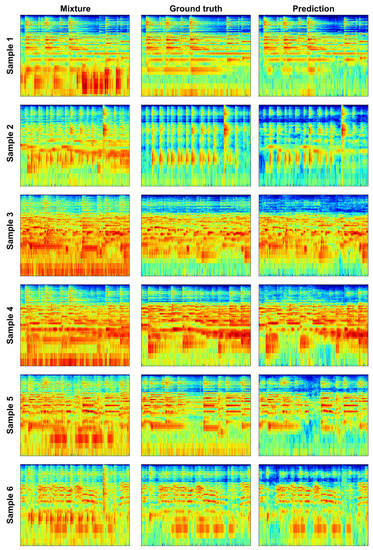 Figure 5. Separation results of the proposed method. We show the log-scale spectrograms obtained from the left channels of the sound mixture, the OSS ground truth, and the OSS predictions. Each spectrogram displays time (0 s to 5.11 s) along the horizontal axis and frequency (0 to 8000 Hz) along the vertical axis. The red indicates more prominent sounds. These spectrograms were obtained using the open-source librosa tool [42]. The accuracy of the separation achieved for each sample was determined by how closely the prediction matched the ground truth.