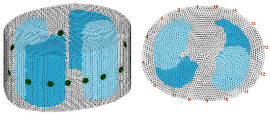 Figure 1. The 3D FEM model generated for simulation; simulation pattern c is demonstrated. The dark blue area represents σ l u n g n o n - v e n t = 0.5 , while the light blue area represents σ l u n g v e n t = 0.25 . Left: the 3D FEM model with simulation pattern c. Right: the aerial view of the 3D FEM model with simulation pattern c and the numbers of the electrodes.