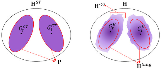where G l G T represents the centre of gravity of the left lung in the ground truth H G T , G l H is the centre of gravity of the left lung in the reconstructed image H , G r G T is the centre of gravity of the right lung in the ground truth H G T , and G r H is the centre of gravity of the right lung in the reconstructed image H . The left and right lung in reconstruction image are from the lung region H l u n g .
