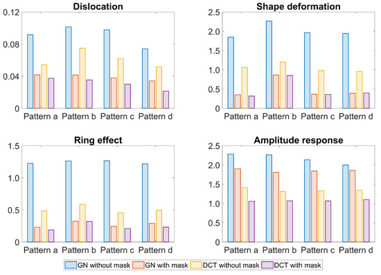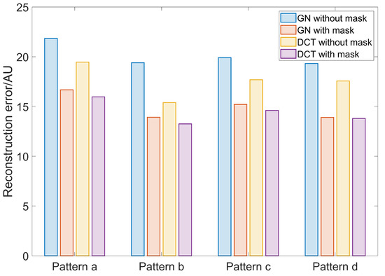 Figure 4. The reconstruction error of the results using the GN and DCT approaches without and with a structural prior mask. Blue bars: GN without structural prior mask; orange bars: GN with structural prior mask; yellow bars: DCT without structural prior mask; purple bars: DCT with structural prior mask.