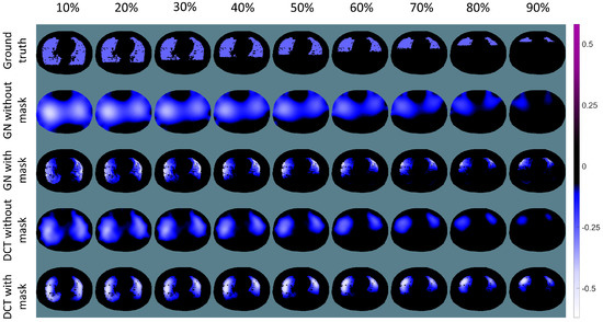 The conductivity reconstructions for the four different ventilation patterns using the GN and DCT approaches are depicted in Figure 3. All the pixels of the images were normalised between −0.5 to 0.5, ensuring that all the images can be displayed with the same colormap. Black areas show no conductivity change, while blue or purple areas indicate the decrease or increase of the conductivity, respectively. The first row of Figure 3 demonstrates the conductivity changes applied in the simulation, i.e., the ground truth. The second row and third row illustrate the EIT reconstructions using the GN approach without and with a structural prior mask, respectively. The last two rows illustrate the reconstructions using the DCT approach without or with a structural prior mask, respectively. Without a structural prior mask, the EIT reconstructions lead to blurred edges with rather strong ring effects, which can be found in the reconstructions of both approaches (GN and DCT). In addition, anatomical details, e.g., the bronchus, with no conductivity change within the lung, cannot be observed in the reconstructions without a structural prior mask, while these details are preserved in the results using a structural prior mask. It is worth noting that even without a structural prior mask the EIT reconstructions from the DCT approach bear less artefacts.