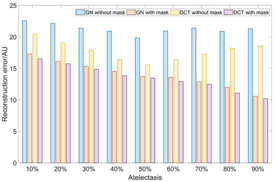 Figure 7. The reconstruction error calculated from the results of the simulation in terms of different scales of atelectasis. Blue bars: GN without structural prior mask; orange bars: GN with structural prior mask; yellow bars: DCT without structural prior mask; purple bars: DCT with structural prior mask.