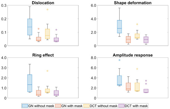 The figures of merit of the reconstructions using the GN or DCT approaches with and without a structural prior mask are depicted in Figure 5. In general, introducing a structural prior mask to using the GN or DCT approach decreases the dislocation, shape deformation, and ring effect compared to the results without a structural prior mask. This complies with the finding in Figure 3, e.g., a reduced ring effect around the edge. In addition, even without a structural mask the amplitude response stays more stable in the DCT approach than in the GN approach.
