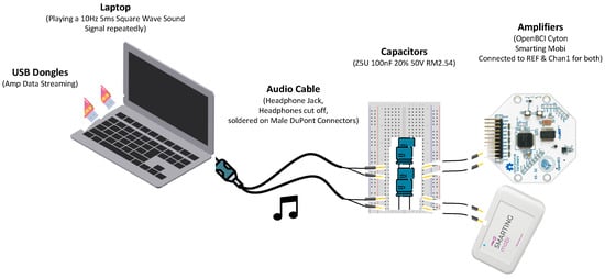 Using the EEG amplifiers as oscilloscopes, we adapted the protocol from [23] to a desktop PC, which allowed us to evaluate and quantify the temporal precision of the amplifiers using audio signals. The core part of this timing test protocol is that the signal on the audio jack is fed directly into the EEG amplifiers, whose signals are transmitted through the Bluetooth dongle and recorded by the corresponding desktop PC. This setup can measure the time between the programmatic start of the playback of a sound, marked by a stimulus event marker, and the actual playback onset of the sound, as indicated by the audio jack voltage fluctuations, with EEG sampling rate precision (here: 125 to 500 Hz sampling rate, resulting in 8 ms to 2 ms precision). To prevent possible damage to the amplifier and a clipped signal, the volume is set to a medium level (35%). Additionally, capacitors (ZSU 100 nF 20% 50 V RM2.54) were integrated in the circuit to prevent accidental power surges from damaging the amplifiers.