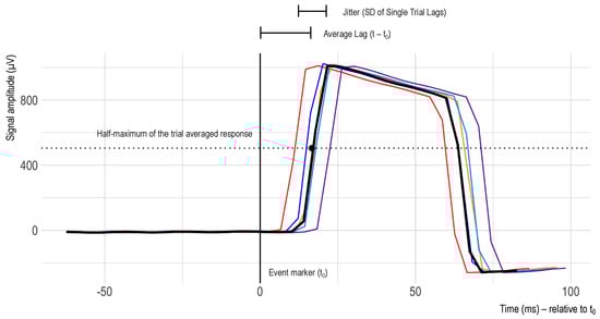 To extract the single trial epochs from the continuous recording of the square wave signal, the recorded data were cut between −200 ms and +800 ms after the stimulus software marker. The timestamp of this software marker was thus set as the timing reference (t0). Afterwards, the delay between the stimulus marker and the signal amplitude increase (onset) was assessed. In alignment with [23], the single trial latency was defined as the time between marker onset and the amplitude exceeding the half-maximum of the trial-averaged response. Additionally, latency jitter was defined as the standard deviation of those single trial latencies, and latency lag was defined as the mean of the single trial latencies (see Figure 4).
